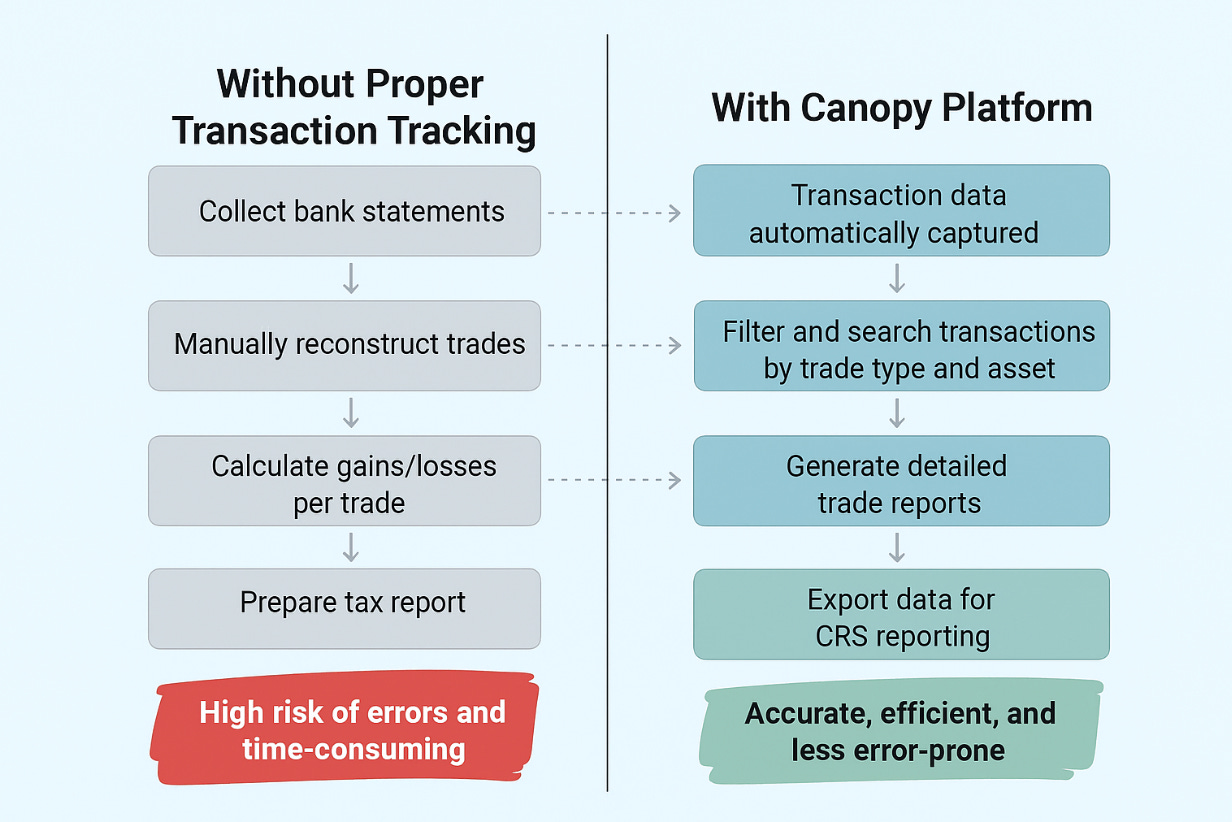 After switching to Canopy, the same task took under 15 minutes. All trades were already captured, structured, and categorized. The accountant simply filtered by date, selected a reporting format, and exported a complete CRS-ready report.